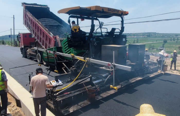 其中山推產品施工內容包括:攤鋪機進行一次性面層鋪設,鋪設寬度8-8.5m;鋪設后先雙鋼輪振動壓實,后膠輪壓路機靜碾揉搓表面壓實,施工遍數兩次。施工后進行壓實度、平面度測量,達到施工標準要求。