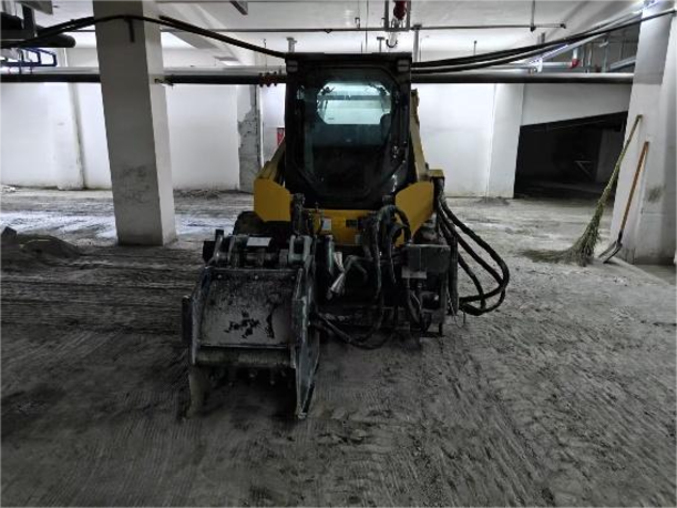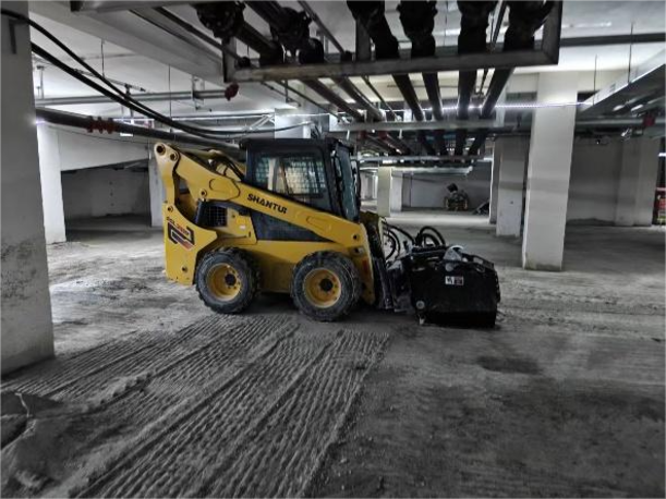該小區地處市區核心板塊,周邊配套完善,地庫總面積約3萬平方米,整體為水泥硬化地面。為滿足后續自流平地坪施工的需求,地面必須經過銑刨處理,確保材料與基礎面充分貼合。此前,客戶主要采用人工手推式銑刨鼓進行處理,效率低、粉塵大、勞動強度高,難以滿足項目對施工進度和質量的一致性要求。