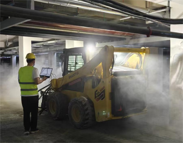 項目啟動后,山推技術團隊為客戶量身推薦了SSL75V-M滑移裝載機,配置快換銑刨鼓及清掃器等屬具。面對地庫內2.1米的高度限制,SSL75V-M整機高度僅2065mm,轉向靈活,在狹小空間內表現出色;配套的大流量屬具液壓系統,保障了銑刨鼓的動力輸出,在硬質水泥地面也能高效作業,日均銑刨面積可達1000㎡,施工效率提升75%以上。