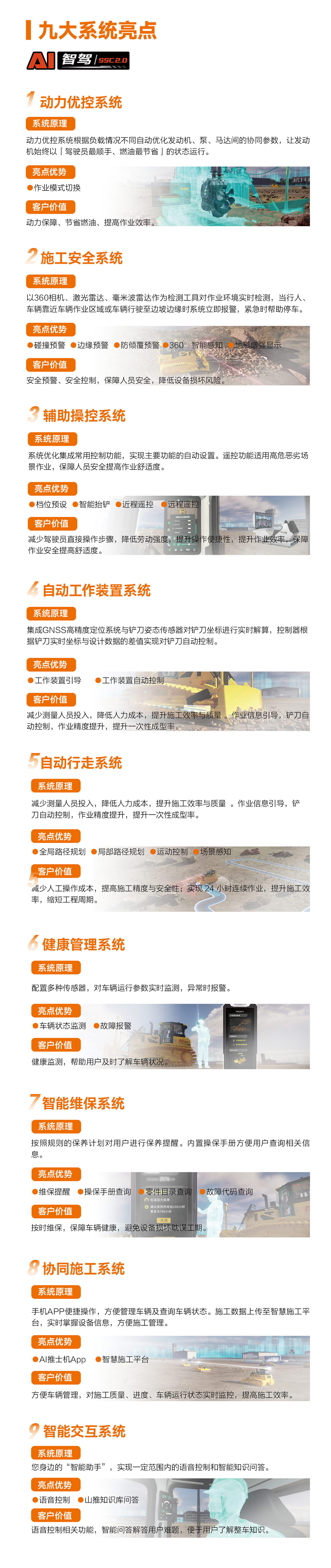 AI智駕:DH24-G 推土機,可基于山推SSC( SHANTUI Smart Constuction)技術平臺實現AI升級,融合人工智能、大數據相關技術,構建 “感知 - 決策 - 執行” 全智能閉環,實現工況研判、路徑動態優化、鏟刀厘米級精控,以技術革新引領工程機械智能化躍遷,是行業從 “機械作業” 向 “智能決策” 跨越的典范之作。